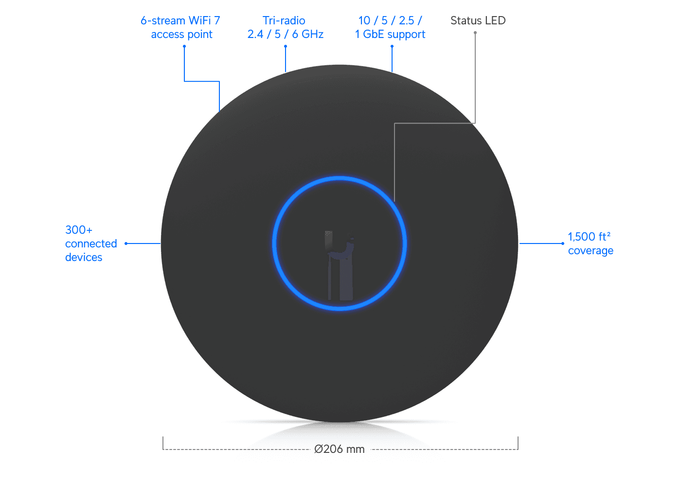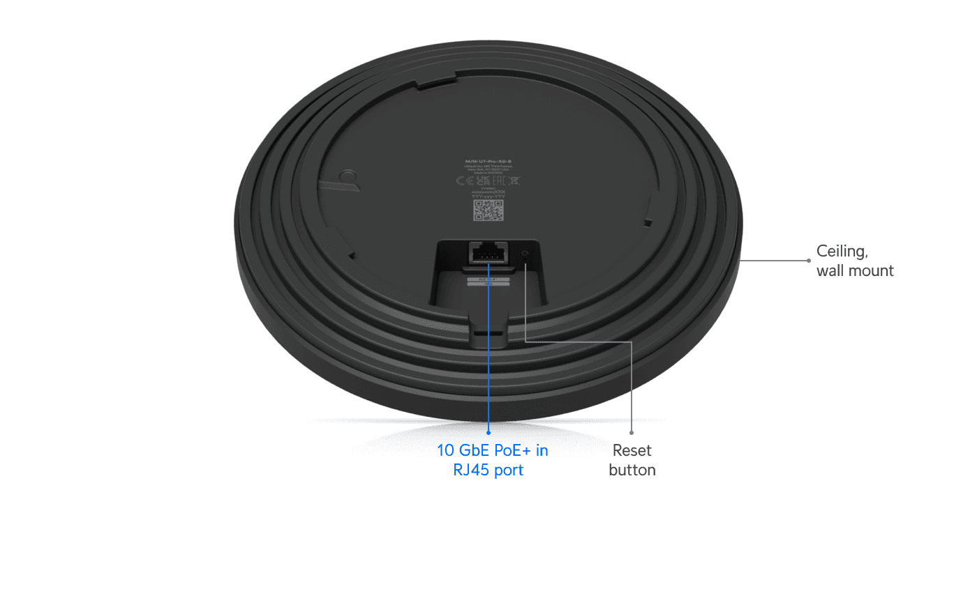 Ceiling-mounted 6-stream WiFi 7 AP with 10/5/2.5/1 GbE support.
